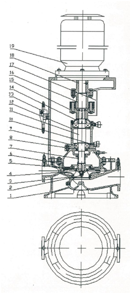 1.泵體 2.葉輪螺母 3.密封環(huán) 4.葉輪 5.鍵 6.泵蓋 7.機械密封 8.油封 9.軸承 10.旋蓋式油杯 11.軸 12.軸承體 13.旋液分離器 14.壓蓋 15.泵聯(lián)軸器 16.中間聯(lián)軸器 17.護罩 18.電機連接法蘭 19.電機